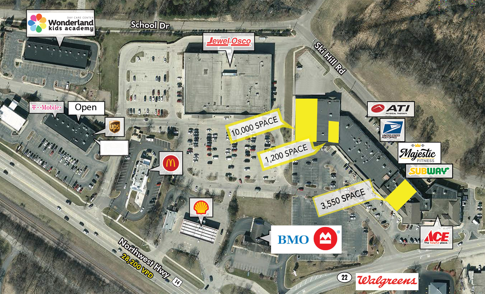 Space can be used for Retail or Office.• Lighted Intersection • Electronic Signage on Rte. 14 & 22 • 34,000 vehicles per day on Rte. 14 • Excellent Demographics.Great Rates, Close to Restaurants, On-Site Fitness Club, Post Office, Hardware Store, Cleaners, Plenty of Parking Neighboring Businesses: Jewel-Osco, McDonalds, BMO Harris Bank, Subway, ATI Physical Therapy, Majestic Fitness, USPS, UPS Store, Walgreens, Shell, Ace Hardware, ACL Labs. Agent has interest.